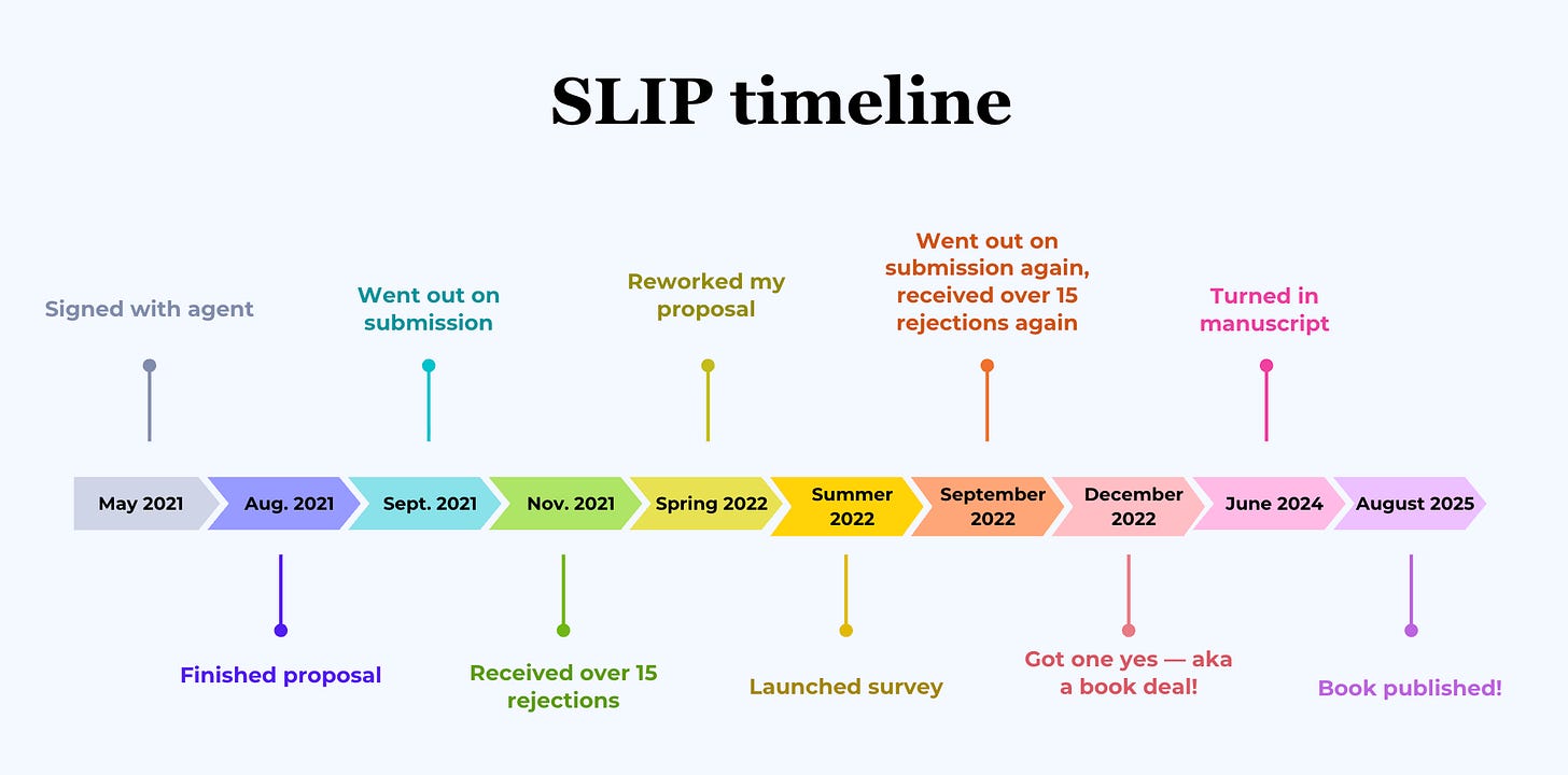 The path to publication for my first book, SLIP: Life in the Middle of Eating Disorder Recovery, was more circuitous than I ever could have imagined. It was laden with rejections and obstacles that derailed me and could have led to my book’s demise. Within a year-and-a-half period, I received nearly 50 rejections — roughly 35 from Big Five book publishers and the rest from writing residencies, fellowships, and grants.