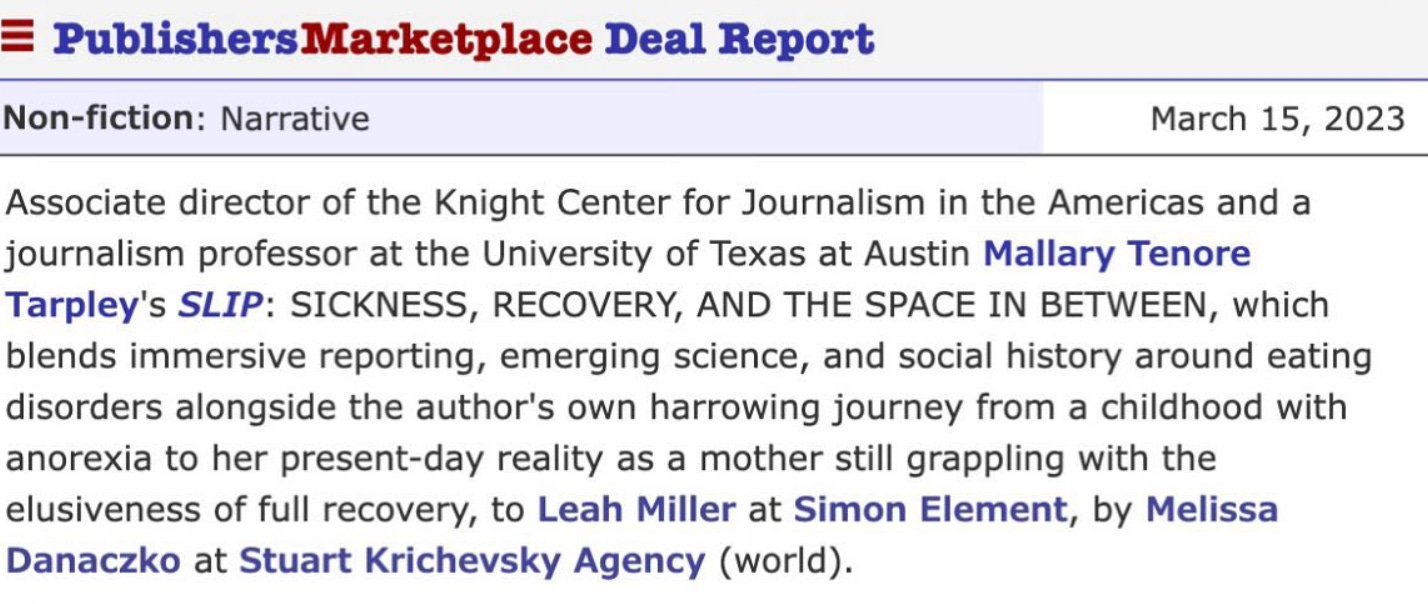 I spent the next year interviewing others with lived experience, as well as clinicians and researchers who treat and study those with eating disorders, and I reworked my proposal accordingly. Instead of pitching SLIP as a literary memoir, I pitched it as a book that would blend personal narrative, reportage, and research. This approach eventually landed me a book deal and ultimately made my writing better. All of this additional reporting also led me to win the Sloan Foundation grant and the PROSE award.
